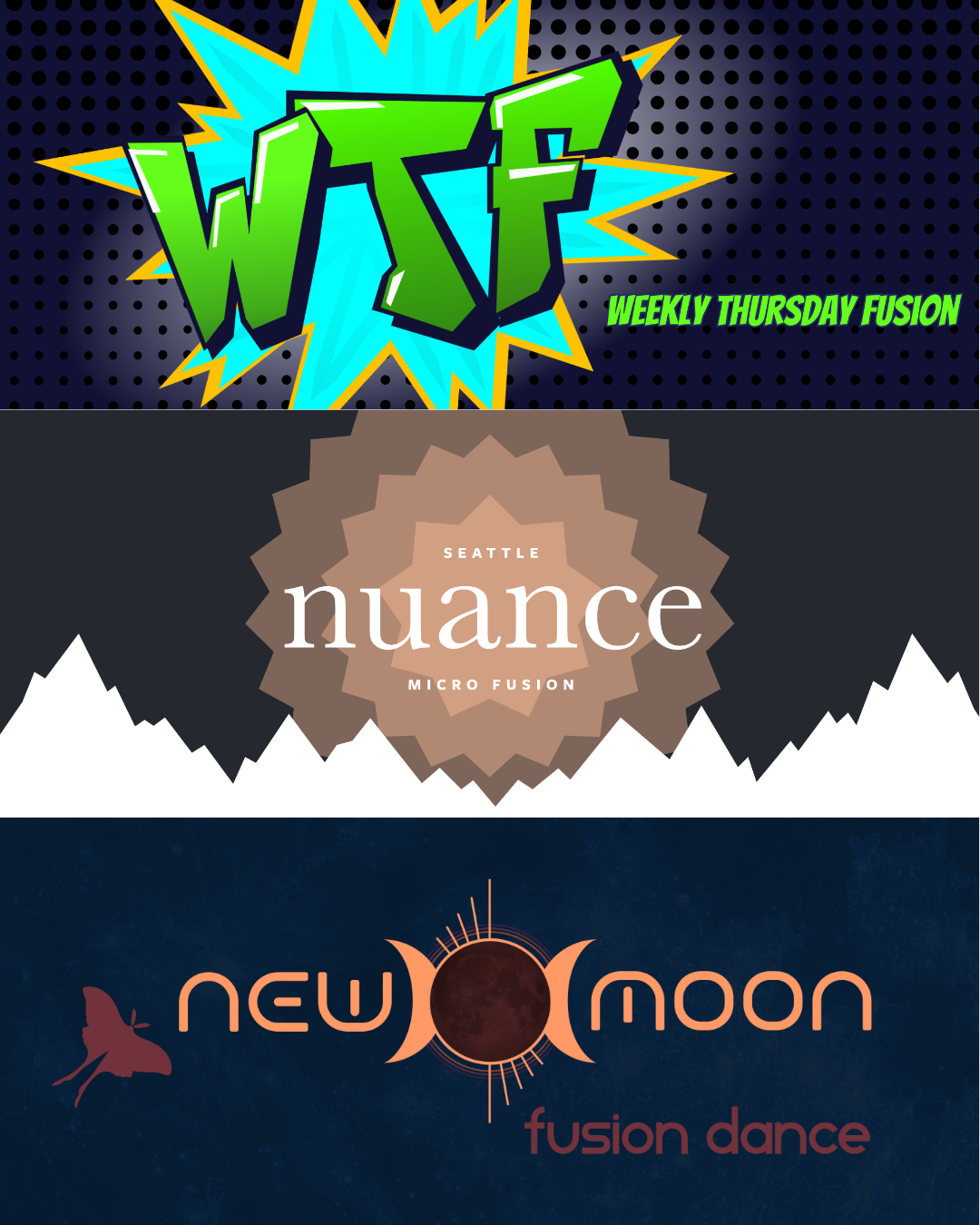 This month, we are not alone! - nuance is one of three back to back fusion events in Seattle, making 3 nights of fusion and an informal “weekender” event. Check out our sister events: